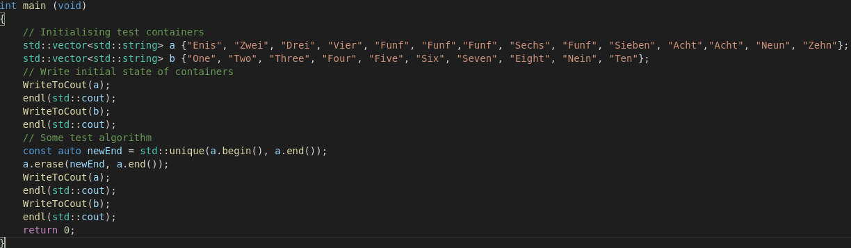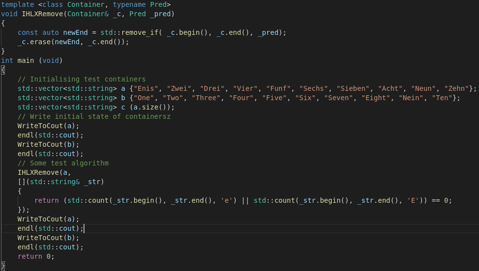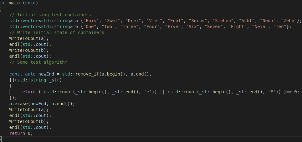 그런데 곰곰이 생각해 보았을 때, 정렬의 문제가 발생합니다. 첫 번째에 기술한 방법처럼 삭제를 하고 빈 자리가 보일 때마다 계속 바꾸는 방식을 채택하면 충분히 많은 양의 원소에 대해서 어마어마한 Running time을 발생시키게 됩니다. 그래서 원소의 정렬을 고려하지 않고 벡터의 처음부터 끝까지 Predicate에 대해서 검증을 끝마치고 빈 자리마다 Vector의 끝에서 하나 씩 move하는 알고리즘을 사용할 수도 있습니다. 그 이후에 정렬이 반드시 필요하다면 적합한 정렬 알고리즘을 수행하는 편이 나을 것입니다. 이전 std::copy에서 썼던 코드를 그대로 활용하도록 하겠습니다. 만들어 볼 것은 알파벳 'E', 'e'가 포함되지 않은 문자를 제거하는 함수를 만들어 볼 것입니다.